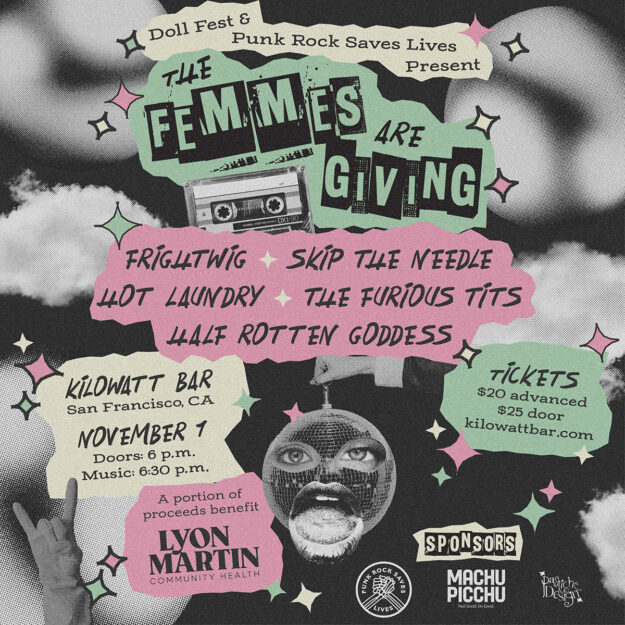 Hey Doll Fest Fam! Join us in a night of music celebrating femmes babes in the local scene while helping out even more babes in the scene! A portion of proceeds will be donated to local San Francisco clinic Lyon Martin and Punk Rock Saves Lives will be on-site adding more donors to their list while passing out resource information about health care, mental health and more! Let’s rock babes! See you Nov 1st!